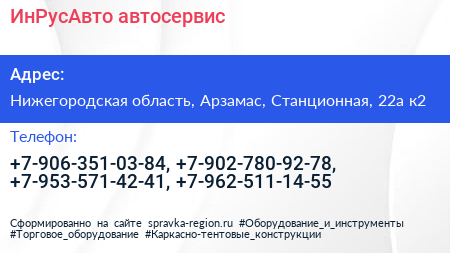 ИнРусАвто, автосервис по адресу Нижегородская область, Арзамас, Станционная, 22а к2 в дальнейшем Организация, размещена в следующих категориях: