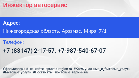 Инжектор, автосервис по адресу Нижегородская область, Арзамас, Мира, 7/1 в дальнейшем Организация, размещена в следующих категориях: