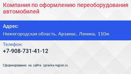 Компания по оформлению переоборудования автомобилей по адресу Нижегородская область, Арзамас, Ленина, 110ж в дальнейшем Организация, размещена в следующих категориях: