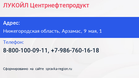 ЛУКОЙЛ-Центрнефтепродукт по адресу Нижегородская область, Арзамас, 9 мая, 1 в дальнейшем Организация, размещена в следующих категориях: