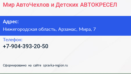 Мир АвтоЧехлов и Детских АВТОКРЕСЕЛ по адресу Нижегородская область, Арзамас, Мира, 7 в дальнейшем Организация, размещена в следующих категориях: