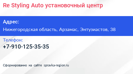 Re-Styling Auto, установочный центр по адресу Нижегородская область, Арзамас, Энтузиастов, 38 в дальнейшем Организация, размещена в следующих категориях: