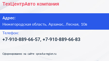 TexЦентрАвто, компания по адресу Нижегородская область, Арзамас, Лесная, 10в в дальнейшем Организация, размещена в следующих категориях: