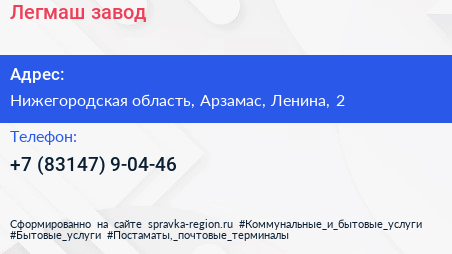 Легмаш, завод по адресу Нижегородская область, Арзамас, Ленина, 2 в дальнейшем Организация, размещена в следующих категориях: