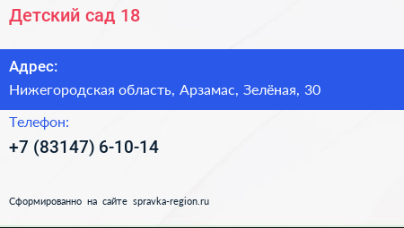 Детский сад №18 по адресу Нижегородская область, Арзамас, Зелёная, 30 в дальнейшем Организация, размещена в следующих категориях: