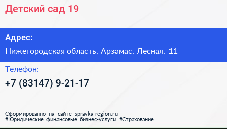 Детский сад №19 по адресу Нижегородская область, Арзамас, Лесная, 11 в дальнейшем Организация, размещена в следующих категориях: