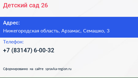 Детский сад №26 по адресу Нижегородская область, Арзамас, Семашко, 3 в дальнейшем Организация, размещена в следующих категориях:
