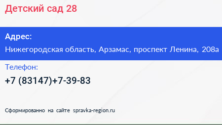 Детский сад №28 по адресу Нижегородская область, Арзамас, проспект Ленина, 208а в дальнейшем Организация, размещена в следующих категориях: