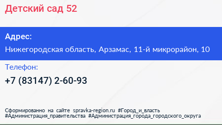 Детский сад №52 по адресу Нижегородская область, Арзамас, 11-й микрорайон, 10 в дальнейшем Организация, размещена в следующих категориях: