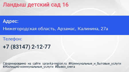 Ландыш, детский сад №16 по адресу Нижегородская область, Арзамас, Калинина, 27а в дальнейшем Организация, размещена в следующих категориях: