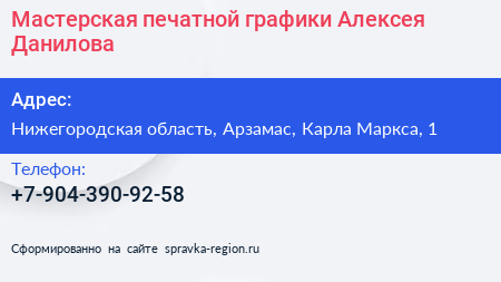 Мастерская печатной графики Алексея Данилова по адресу Нижегородская область, Арзамас, Карла Маркса, 1 в дальнейшем Организация, размещена в следующих категориях: