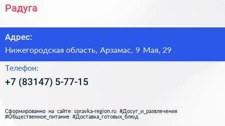 Радуга по адресу Нижегородская область, Арзамас, 9 Мая, 29 в дальнейшем Организация, размещена в следующих категориях: