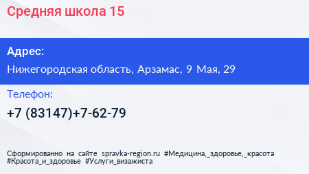 Средняя школа №15 по адресу Нижегородская область, Арзамас, 9 Мая, 29 в дальнейшем Организация, размещена в следующих категориях: