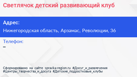 Светлячок, детский развивающий клуб по адресу Нижегородская область, Арзамас, Революции, 36 в дальнейшем Организация, размещена в следующих категориях: