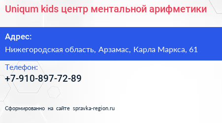 Uniqum kids, центр ментальной арифметики по адресу Нижегородская область, Арзамас, Карла Маркса, 61 в дальнейшем Организация, размещена в следующих категориях: