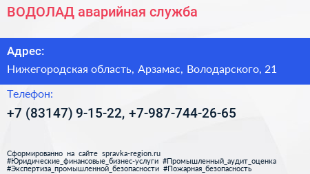 ВОДОЛАД, аварийная служба по адресу Нижегородская область, Арзамас, Володарского, 21 в дальнейшем Организация, размещена в следующих категориях: