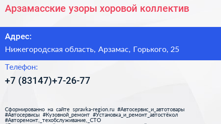 Арзамасские узоры, хоровой коллектив по адресу Нижегородская область, Арзамас, Горького, 25 в дальнейшем Организация, размещена в следующих категориях: