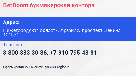 BetBoom, букмекерская контора по адресу Нижегородская область, Арзамас, проспект Ленина, 121Б/1 в дальнейшем Организация, размещена в следующих категориях: