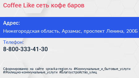 Coffee Like, сеть кофе-баров по адресу Нижегородская область, Арзамас, проспект Ленина, 200Б в дальнейшем Организация, размещена в следующих категориях: