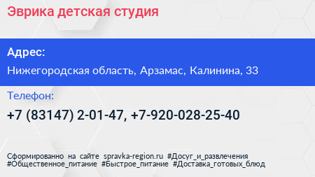 Эврика, детская студия по адресу Нижегородская область, Арзамас, Калинина, 33 в дальнейшем Организация, размещена в следующих категориях:
