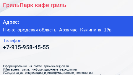 ГрильПарк, кафе-гриль по адресу Нижегородская область, Арзамас, Калинина, 19в в дальнейшем Организация, размещена в следующих категориях:
