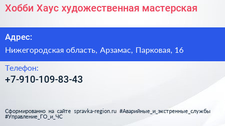 Хобби Хаус, художественная мастерская по адресу Нижегородская область, Арзамас, Парковая, 16 в дальнейшем Организация, размещена в следующих категориях: