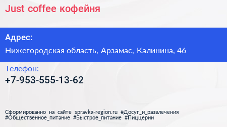 Just coffee, кофейня по адресу Нижегородская область, Арзамас, Калинина, 46 в дальнейшем Организация, размещена в следующих категориях: