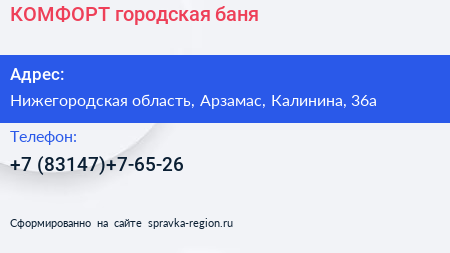КОМФОРТ, городская баня по адресу Нижегородская область, Арзамас, Калинина, 36а в дальнейшем Организация, размещена в следующих категориях: