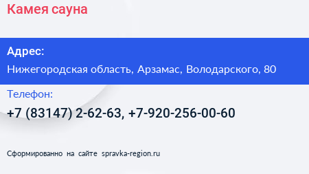 Камея, сауна по адресу Нижегородская область, Арзамас, Володарского, 80 в дальнейшем Организация, размещена в следующих категориях: