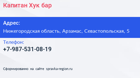 Капитан Хук, бар по адресу Нижегородская область, Арзамас, Севастопольская, 5 в дальнейшем Организация, размещена в следующих категориях: