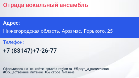 Отрада, вокальный ансамбль по адресу Нижегородская область, Арзамас, Горького, 25 в дальнейшем Организация, размещена в следующих категориях: