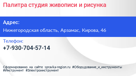 Палитра, студия живописи и рисунка по адресу Нижегородская область, Арзамас, Кирова, 46 в дальнейшем Организация, размещена в следующих категориях: