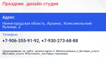 Праздник+, дизайн-студия по адресу Нижегородская область, Арзамас, Комсомольский бульвар, 2 в дальнейшем Организация, размещена в следующих категориях: