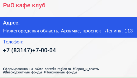 РиО, кафе-клуб по адресу Нижегородская область, Арзамас, проспект Ленина, 113 в дальнейшем Организация, размещена в следующих категориях: