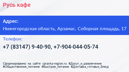 Русь, кафе по адресу Нижегородская область, Арзамас, Соборная площадь, 17 в дальнейшем Организация, размещена в следующих категориях: