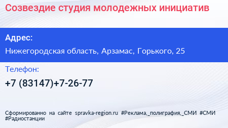 Созвездие, студия молодежных инициатив по адресу Нижегородская область, Арзамас, Горького, 25 в дальнейшем Организация, размещена в следующих категориях: