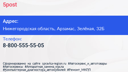 5post по адресу Нижегородская область, Арзамас, Зелёная, 32Б в дальнейшем Организация, размещена в следующих категориях: