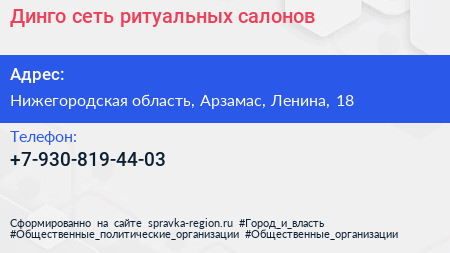 Динго, сеть ритуальных салонов по адресу Нижегородская область, Арзамас, Ленина, 18 в дальнейшем Организация, размещена в следующих категориях:
