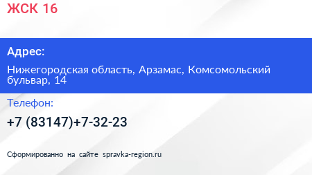 ЖСК №16 по адресу Нижегородская область, Арзамас, Комсомольский бульвар, 14 в дальнейшем Организация, размещена в следующих категориях: