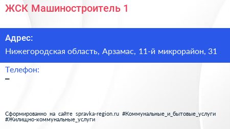 ЖСК Машиностроитель-1 по адресу Нижегородская область, Арзамас, 11-й микрорайон, 31 в дальнейшем Организация, размещена в следующих категориях: