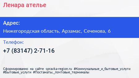 Ленара, ателье по адресу Нижегородская область, Арзамас, Сеченова, 6 в дальнейшем Организация, размещена в следующих категориях:
