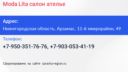 Moda-Lita, салон-ателье по адресу Нижегородская область, Арзамас, 11-й микрорайон, 49 в дальнейшем Организация, размещена в следующих категориях: