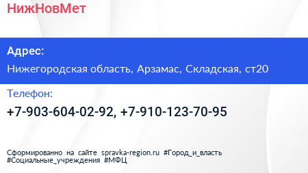 НижНовМет по адресу Нижегородская область, Арзамас, Складская, ст20 в дальнейшем Организация, размещена в следующих категориях: