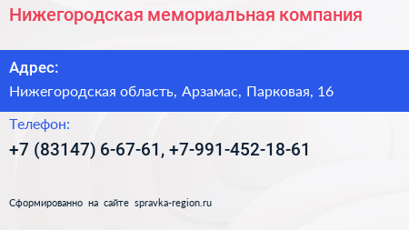 Нижегородская мемориальная компания по адресу Нижегородская область, Арзамас, Парковая, 16 в дальнейшем Организация, размещена в следующих категориях: