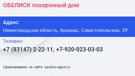 ОБЕЛИСК, похоронный дом по адресу Нижегородская область, Арзамас, Севастопольская, 29 в дальнейшем Организация, размещена в следующих категориях: