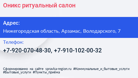 Оникс, ритуальный салон по адресу Нижегородская область, Арзамас, Володарского, 7 в дальнейшем Организация, размещена в следующих категориях: