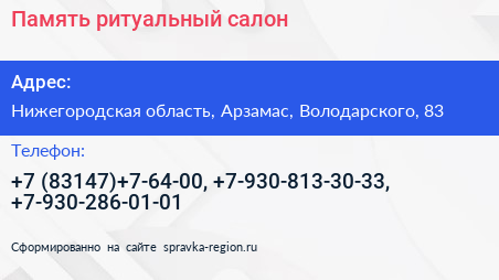 Память, ритуальный салон по адресу Нижегородская область, Арзамас, Володарского, 83 в дальнейшем Организация, размещена в следующих категориях: