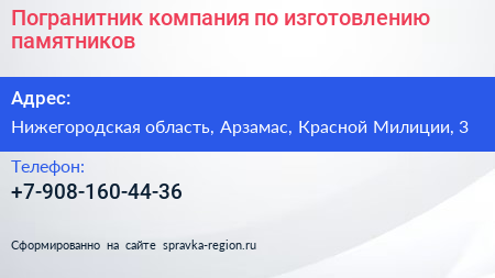Погранитник, компания по изготовлению памятников по адресу Нижегородская область, Арзамас, Красной Милиции, 3 в дальнейшем Организация, размещена в следующих категориях: