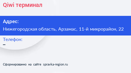 Qiwi, терминал по адресу Нижегородская область, Арзамас, 11-й микрорайон, 22 в дальнейшем Организация, размещена в следующих категориях: