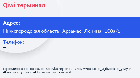 Qiwi, терминал по адресу Нижегородская область, Арзамас, Ленина, 108а/1 в дальнейшем Организация, размещена в следующих категориях: